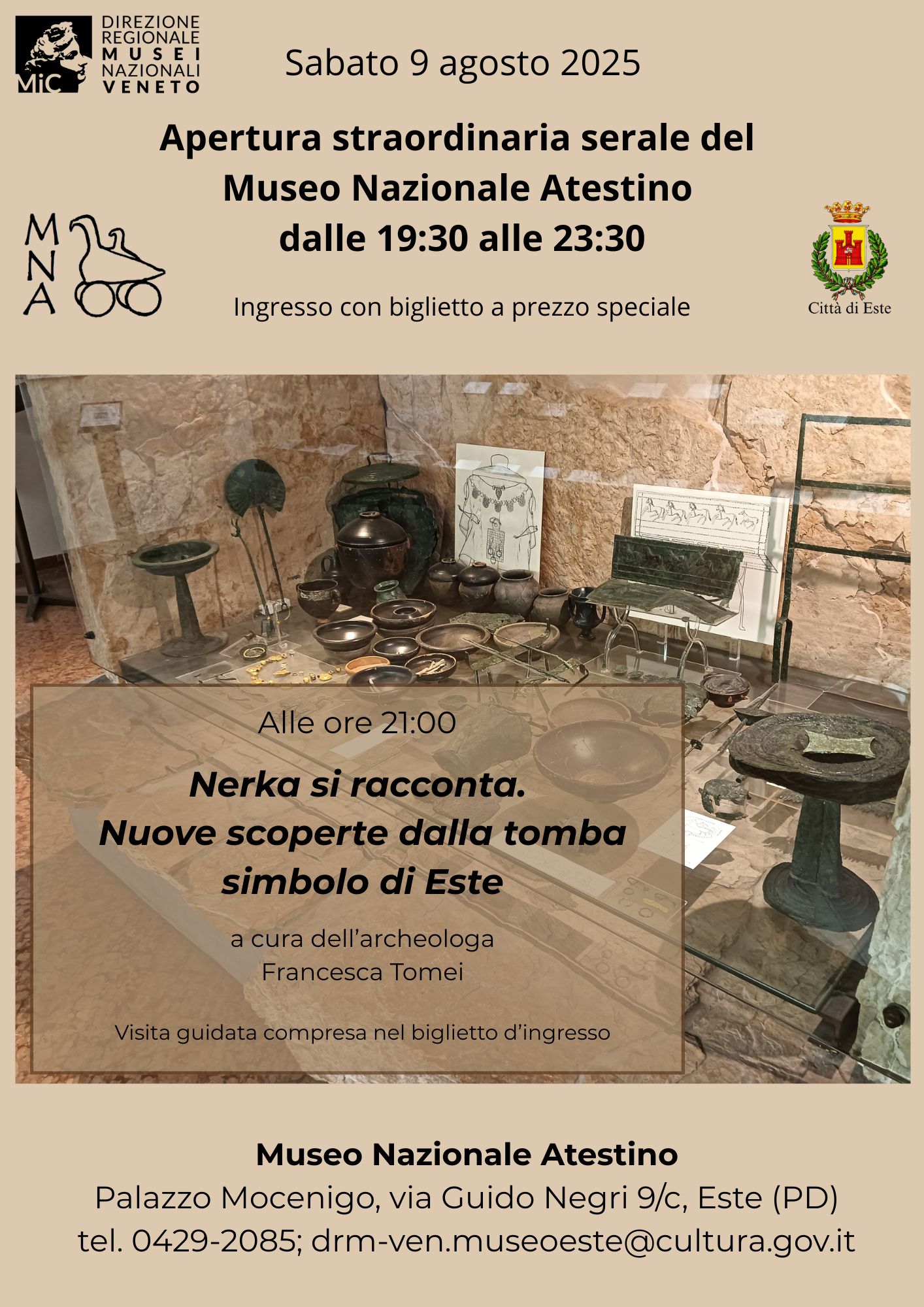Apertura straordinaria serale del Museo, sabato 9 agosto dalle 19:30 alle 23:30 - ultimo ingresso ore 23:00, ingresso con biglietto speciale € 3,00 E , per chi non ha potuto partecipare alla conferenza dello scorso anno, un'altra occasione: alle ore 21:00: Nerka si racconta. Nuove scoperte dalla tomba...